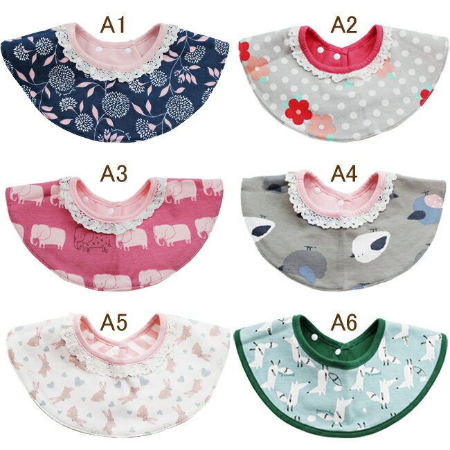 【オシャレなラウンド型スタイ】 やわらかく吸水性の良い綿100%のスタイ 表・裏の二重生地 赤ちゃんが引張っても外れにくいスナップボタン留め 首まわりに合わせて調節できる2段階スナップボタン 付けると洋服の襟のような可愛いデザイン♪